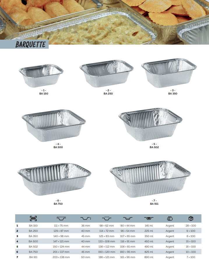 La barquette aluminium BA 150, d’une contenance de 150 ml, est l’outil idéal pour les professionnels des métiers de bouche : traiteurs, restaurateurs, bouchers-charcutiers. Elle permet de cuire, stocker, congeler et réchauffer les préparations dans un seul récipient. emballage cuisson, plat traiteur aluminium, barquette four aluminium