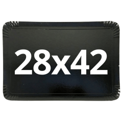 🖤 Plateau traiteur noir (28×42) : carton rigide 1100 g/m², ingraissable, origine France (Isère), compatible boîte 28×42. Lot de 25.